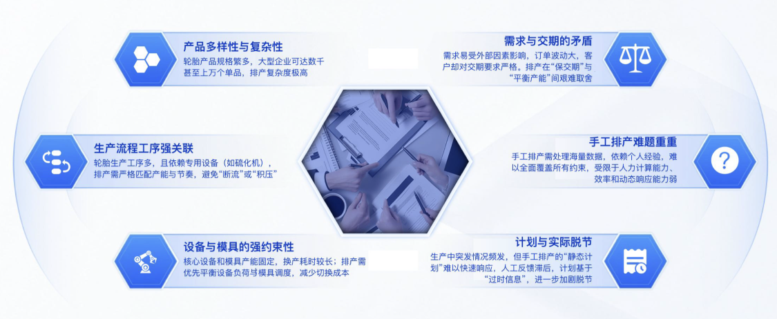 行业特殊性:轮胎生产涉及配方、工艺、设备、模具等多重限制,呈现出“多约束”的复杂特征。
