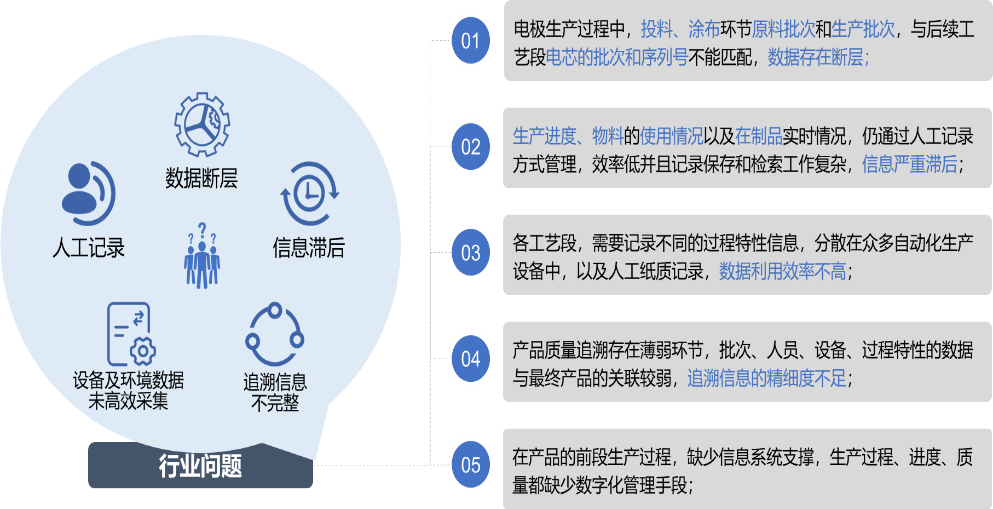 数据断层严重:电极生产中,投料批次、涂布参数与后续电芯序列号无法精准匹配,原料-半成品-成品数据链断裂,追溯时“找不到源头、查不清流向”;
