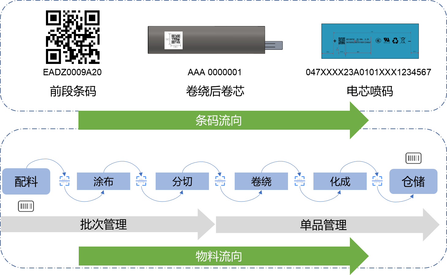批次+单品双轨追溯:配料环节记录原料批次(如磷酸铁锂、导电剂),卷绕环节生成电芯唯一序列号,实现“原料-极片-电芯-模组”全链路正向追踪与逆向溯源;