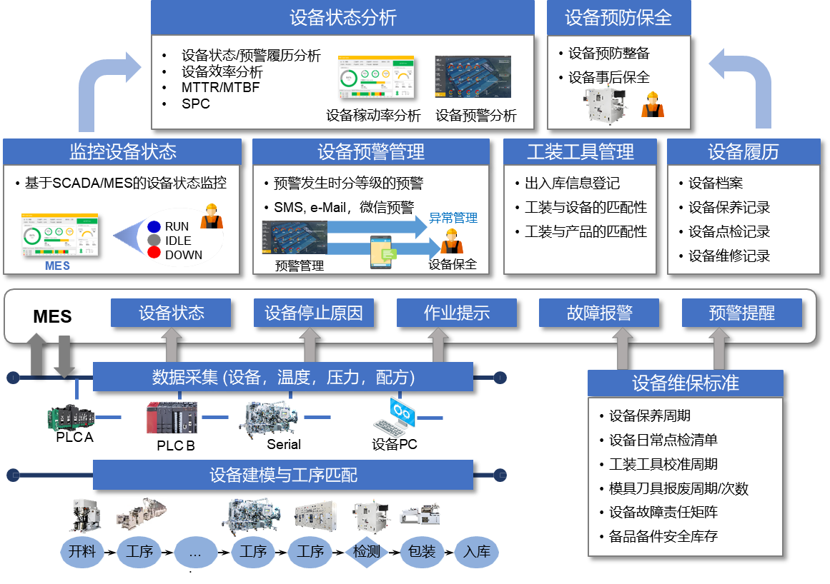 设备状态监控:可视化看板实时展示设备“运行/待机/故障”状态,故障时自动推送报警信息(如卷绕机张力异常),并关联维修手册与备件库存;