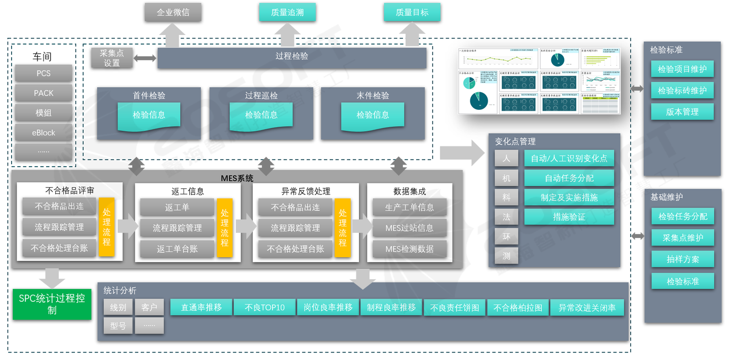 在现代制造业中,制造执行系统(MES)作为连接企业计划层与生产控制层的关键桥梁,在实现过程 质量管控方面发挥着核心作用。ZQ-MES通过数据驱动、流程优化和智能决策等手段,对生产过程进 行全方位、实时化的质量监控与管理,确保产品质量的稳定性和一致性。