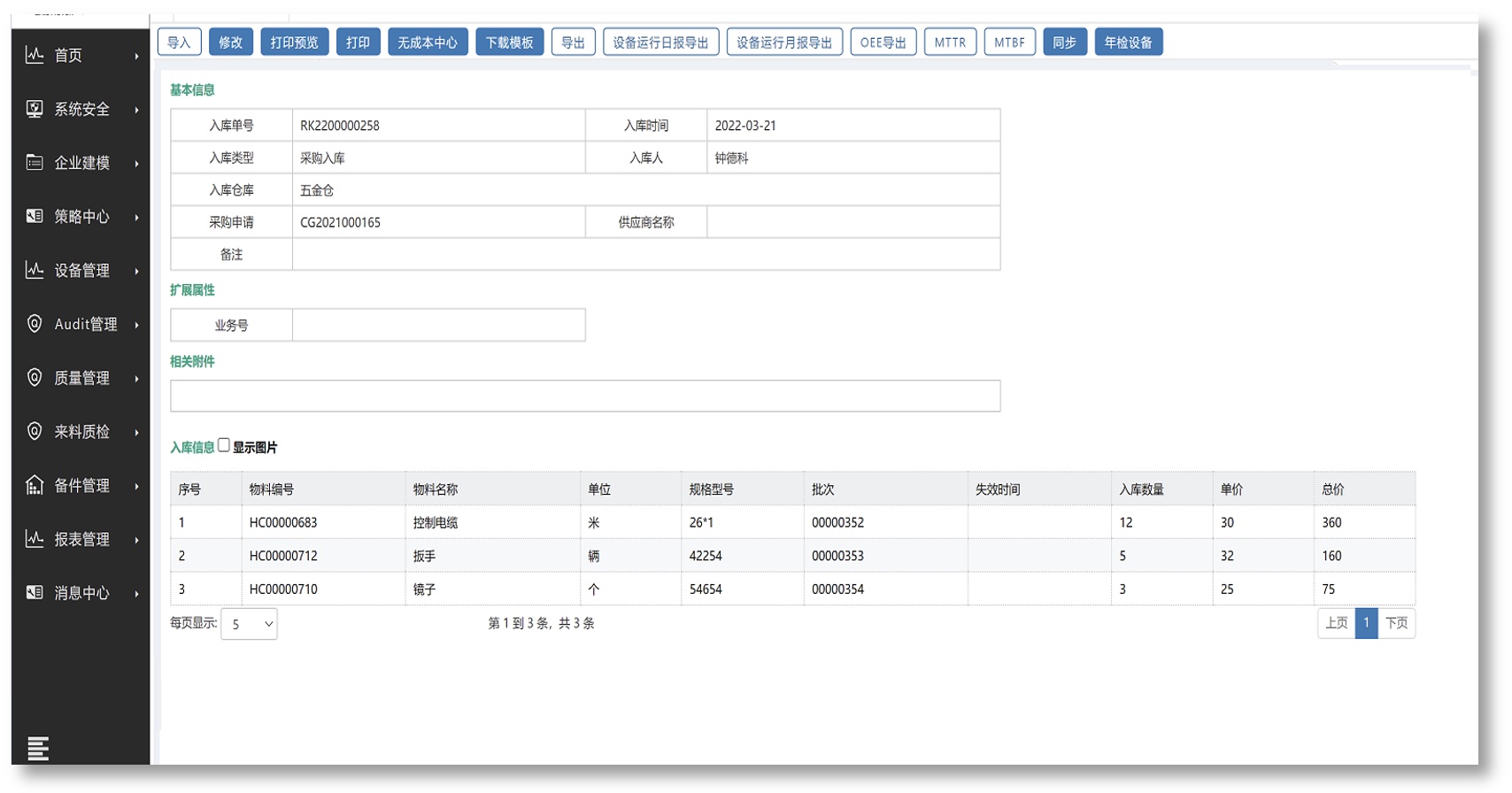 通过信息化手段,实现备品备件入库、出库、库存查询、库存盘点折损、预警提醒等功能的自动化管理。