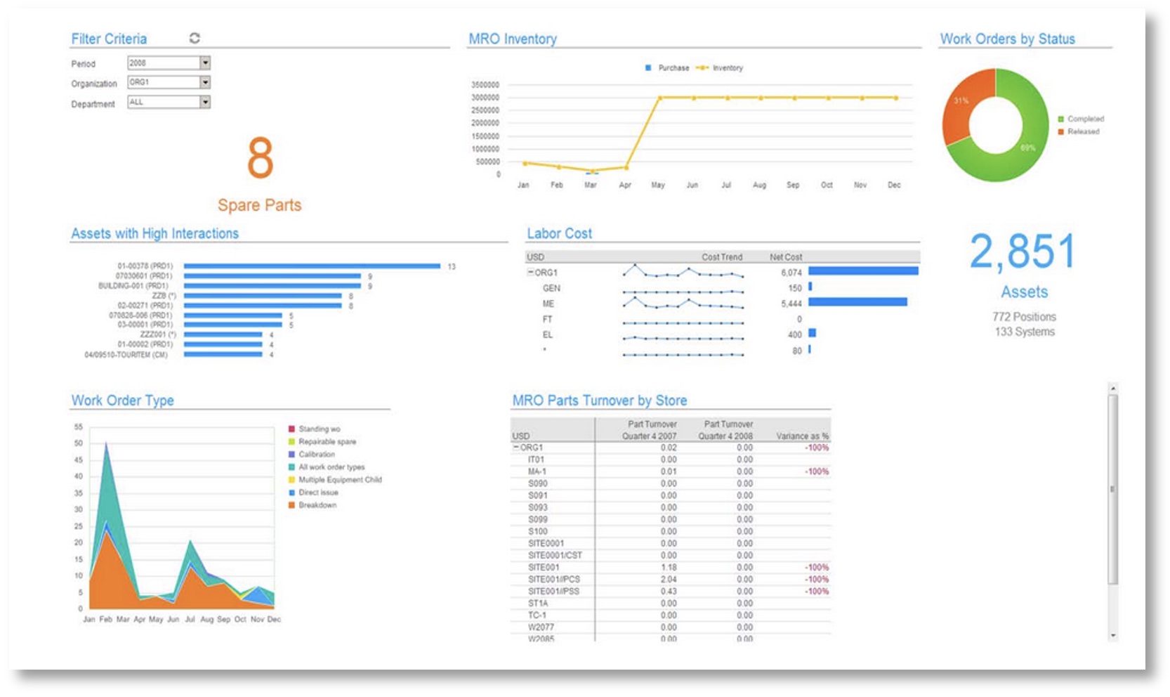 支持多种数据分析方式,提供备件的出入库、库存情况、备件履历、备件出勤率等统计分析。